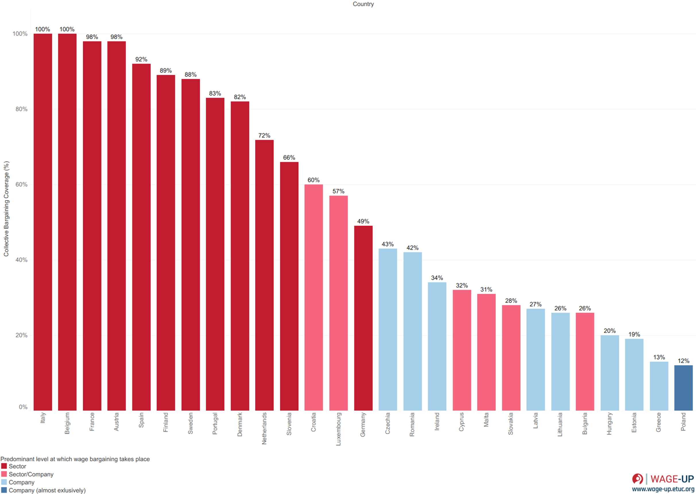 This graph shows the correlation between the predominant level at which wage bargaining takes place (in terms of coverage of employees) and the collective bargaining coverage