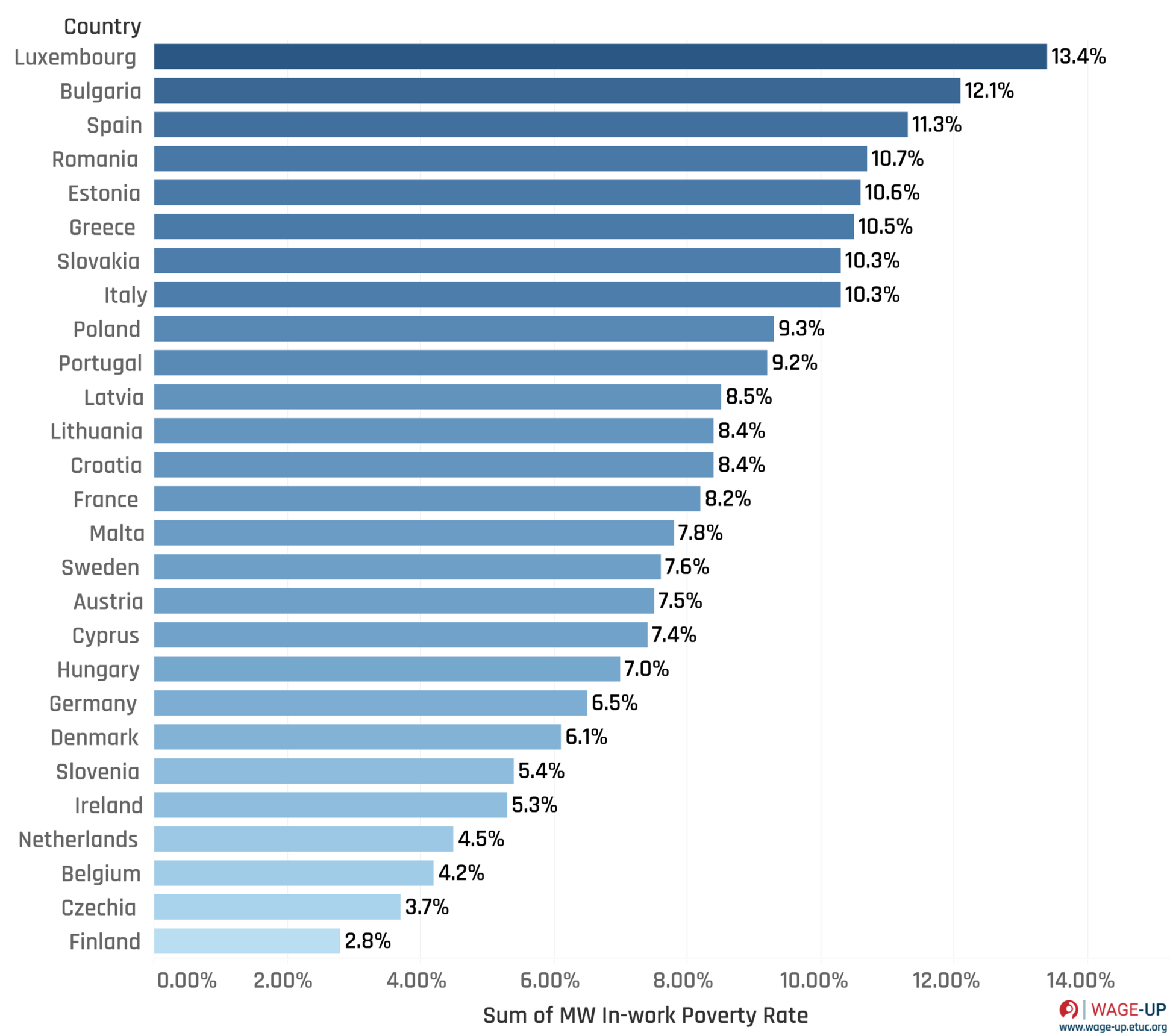 In-work at-risk-of-poverty rate refers to the percentage of persons, who declared to be employed or self-employed, being at risk of poverty (i.e. with a disposable income below the threshold, set at 60 % of the national median disposable income after social transfers) (latest data Eurostat, 2023).