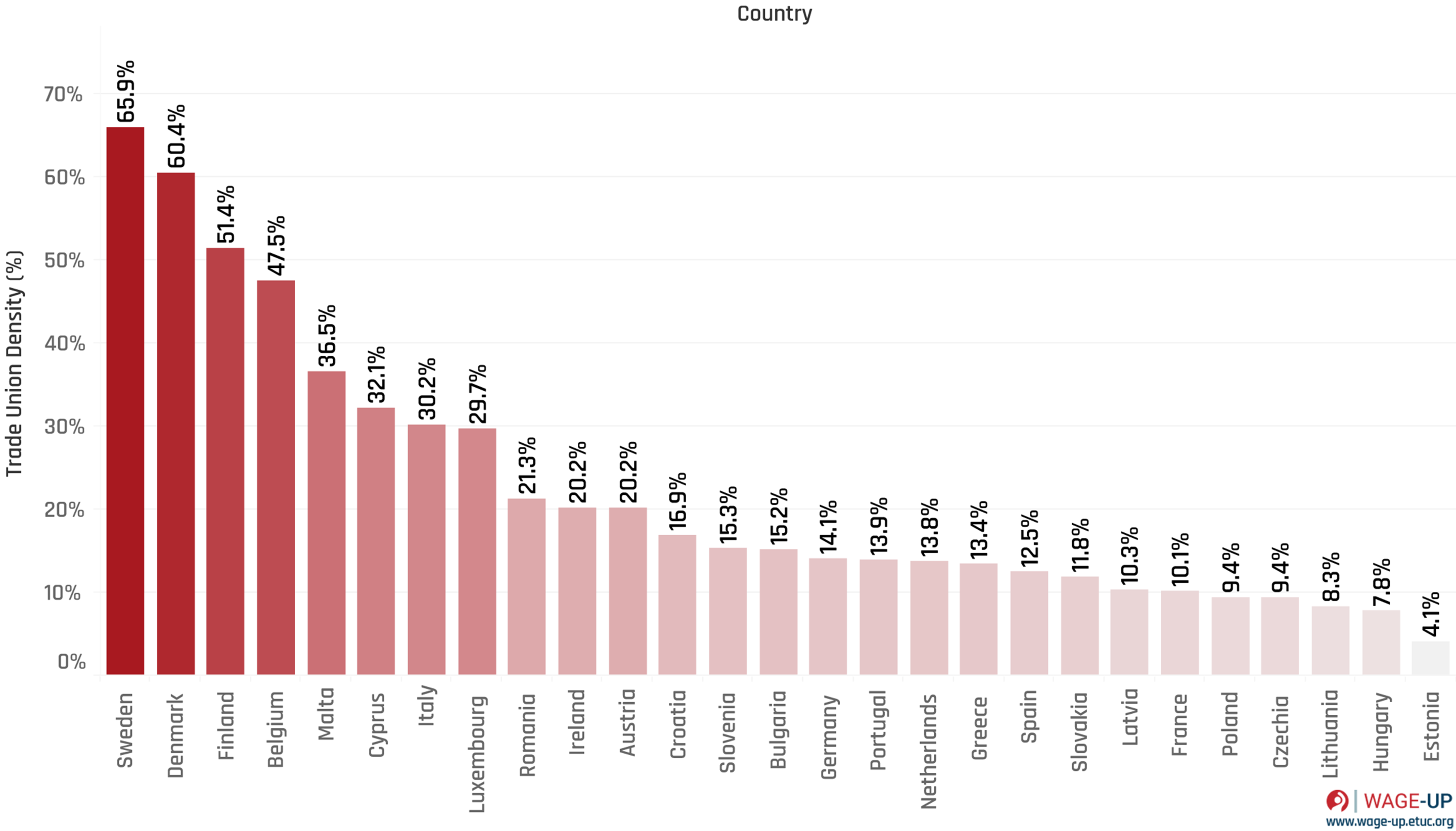 Trade union density is measured as the share of employees who are a member of a trade union (in percent) of the overall workforce (OECD/AIAS ICTWSS database, 2019 or the most recent year available)